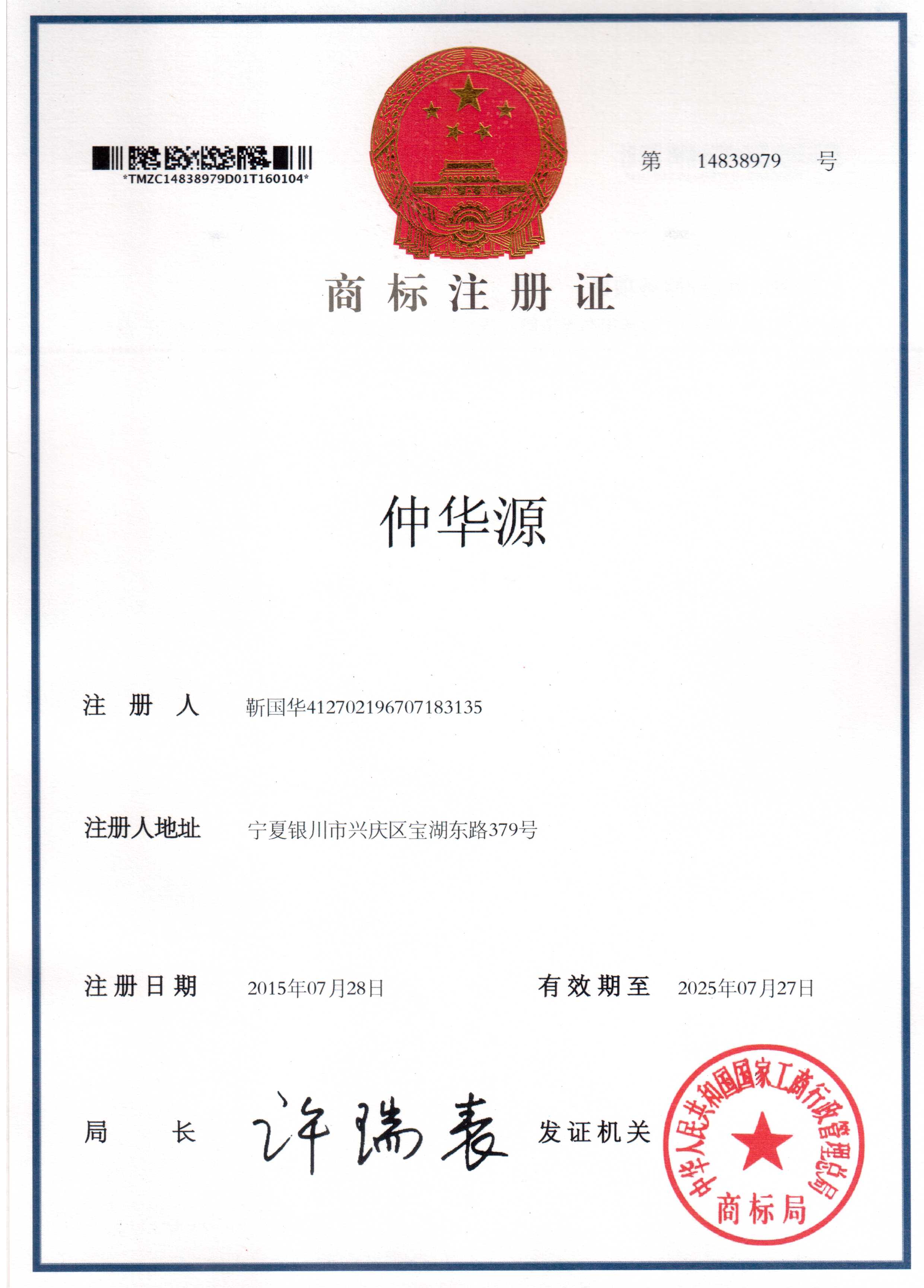 “仲華源”防水材料商標(biāo)獲品 商標(biāo)局發(fā)證書