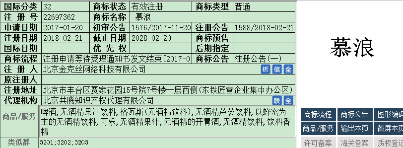 慕浪——第32類商標,可做原漿、奶茶、飲料、礦泉水、啤酒等